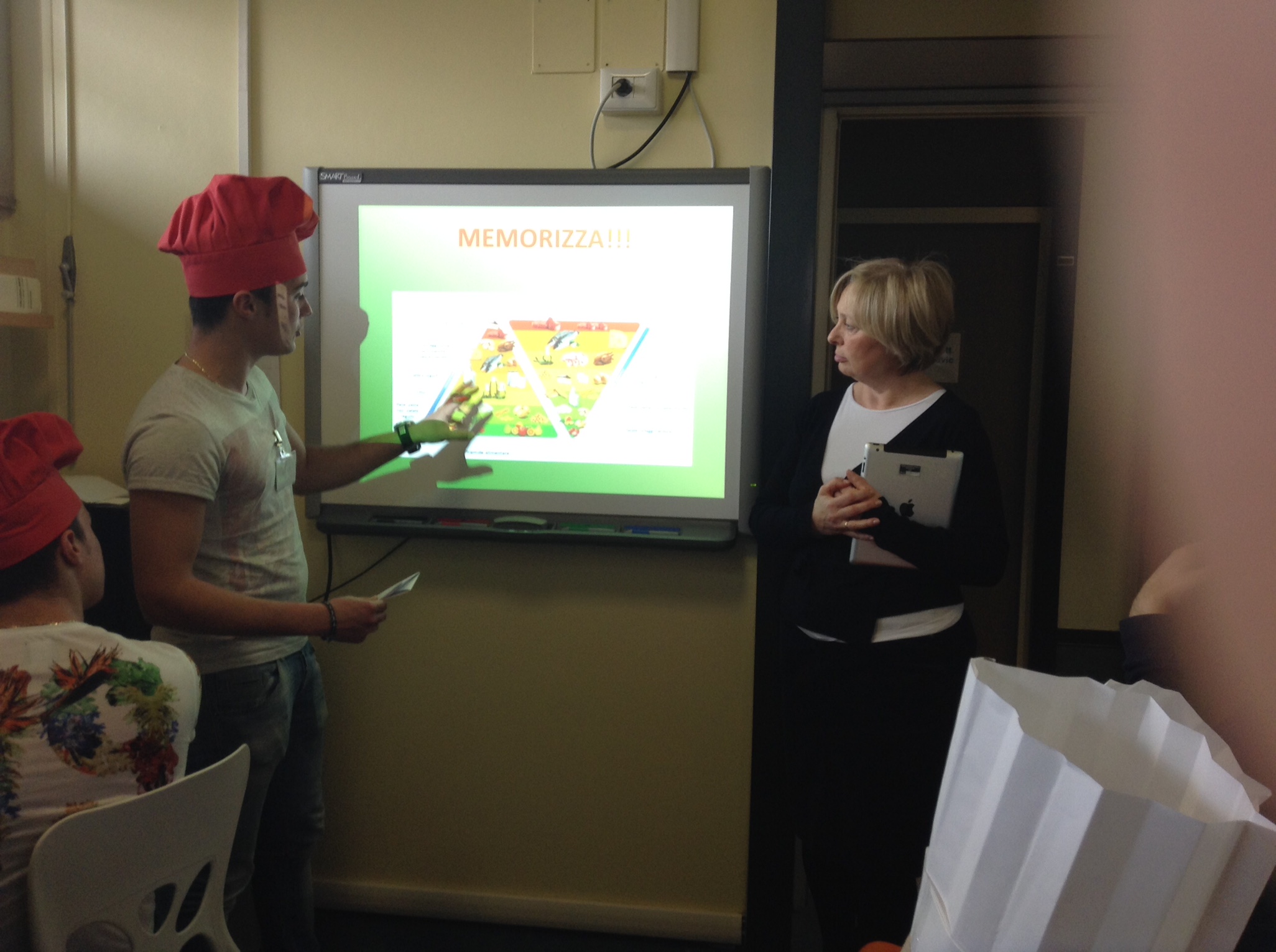 foto doppia piramideQuesto gioco ci ha ricordato che acquistando prodotti provenienti dal proprio territorio, si riducono lo spreco di energia e l’inquinamento prodotti dal trasporto.I ragazzi dell’Istituto Olivetti ci hanno poi presentato anche la piramide alimentare e la piramide ambientale, ci hanno proiettato le immagini delle due piramidi sulla lavagna interattiva multimediale e ci hanno invitato a memorizzare le posizioni degli alimenti. Poi abbiamo iniziato giocare: su un cartellone che rappresentava la piramide ambientale, dovevamo incollare le immagini dei cibi nella giusta posizione: in basso quelli con un minore impatto ambientale, in alto quelli con un maggiore impatto ambientale. Ad esempio la produzione di carne consuma più energia e risorse rispetto alla produzione di frutta e verdura.