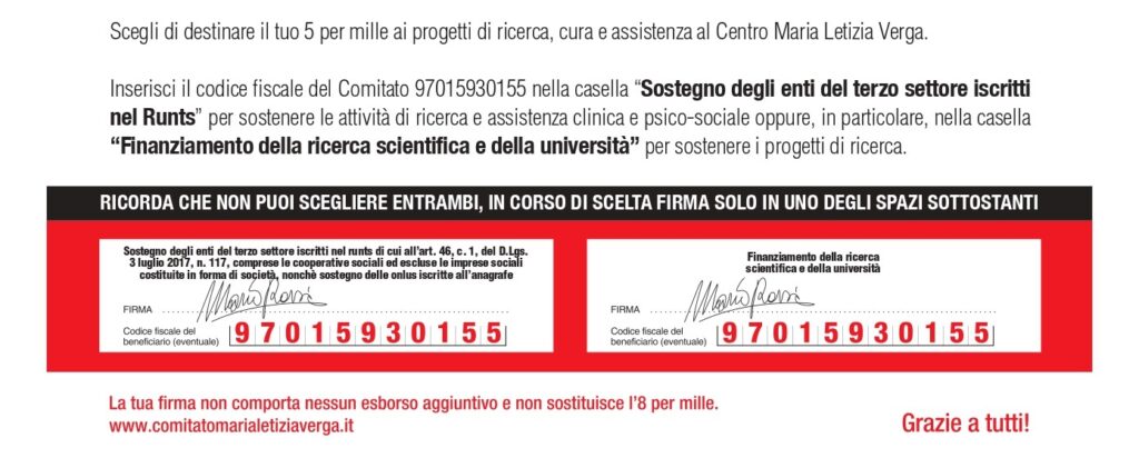 Firma nella casella“Sostegno degli enti del terzo settore iscritti nel Runts” per aiutarci a finanziare i più importanti progetti di ricerca scientifica, assistenza clinica e supporto psicosociale per i bambini/ragazzi in cura presso il Centro Maria Letizia Verga; oppure firma nella casella“Finanziamento della ricerca scientifica e della università” per sostenere i progetti di ricerca.